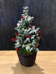Besneeuwd boompje met rode decoratie en lichtjes